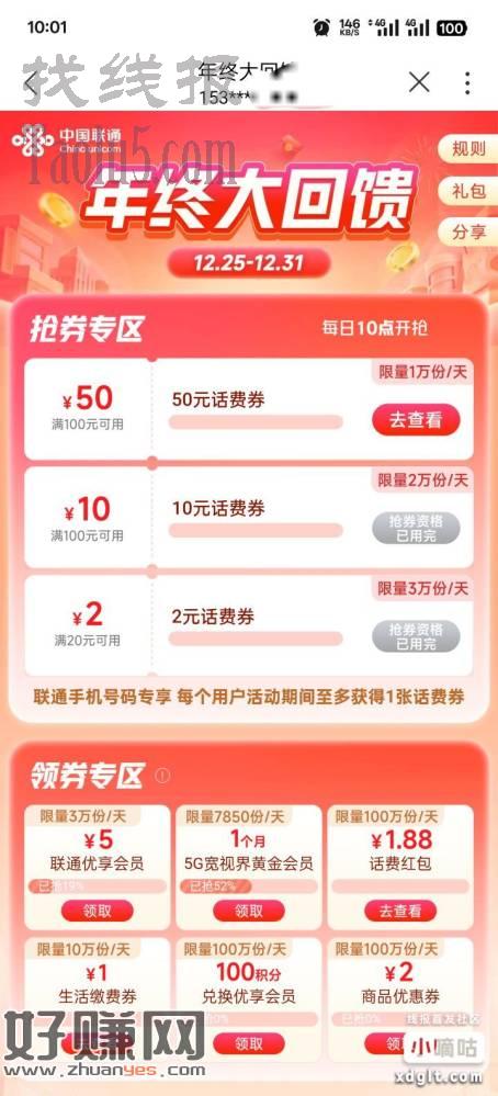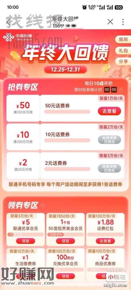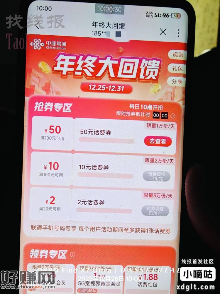 联通50元话费券毕业了,3个号都手动抢到了。里活动结束还有3