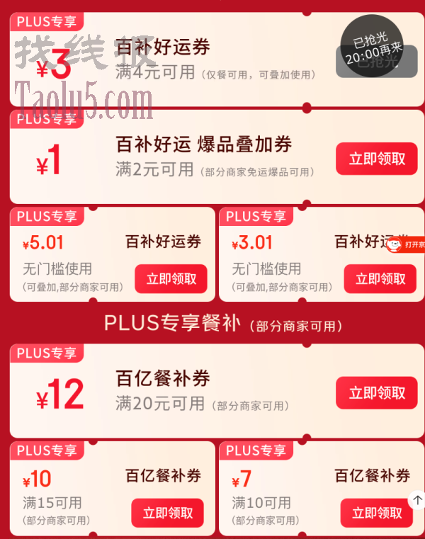14日17点更新:京东外卖现新增PLUS会员专享外卖券,页面可抢4-3百补好运券,无门槛5、3元好运券、百亿餐补满15-10、20-12、10-7百亿餐补券等。满20-12,叠加5元好运券,双重叠加最高满20-17元,同时银行卡支付再减1元。点此页面领券。
