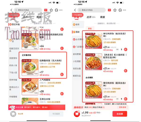 第二步:基于以上两种优惠券,叠加外卖店铺券,大部分外卖5-10元,多数外卖直接0元购,只需要付运费/或者打包费即可,大家想吃啥速度冲啊。塔斯汀满21减20、华莱士满25减20、汉堡王全店满60减34等。