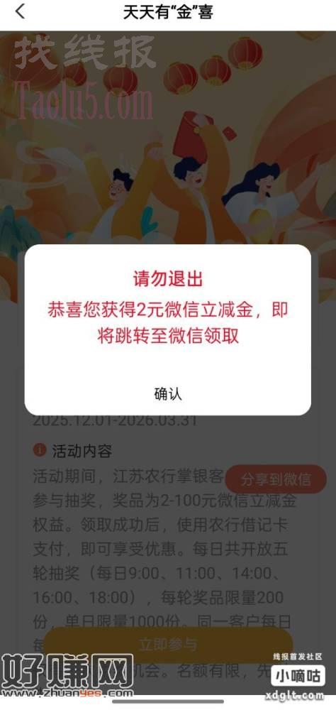 农行江苏地区,城市专区,天天金喜,2元微信立减金