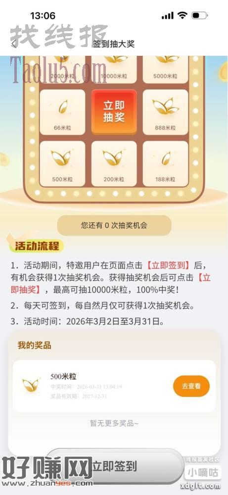 中关村YH5立减金 首页菜单活动拉到底签到一下抽奖中了500米粒兑换5立减金。