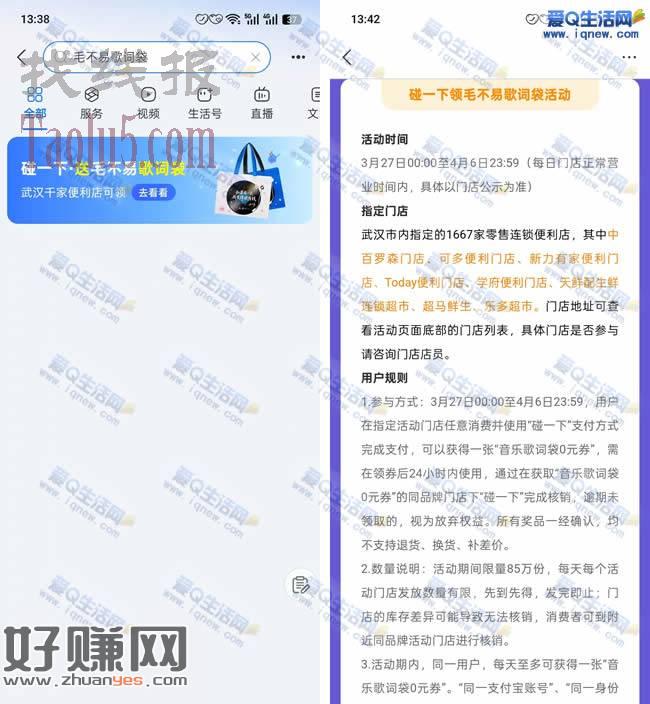 支付宝app搜【毛不易歌词袋】到指定门店用碰一下消费-可得歌词袋0元卷 需线下核销共85w份 4.6截