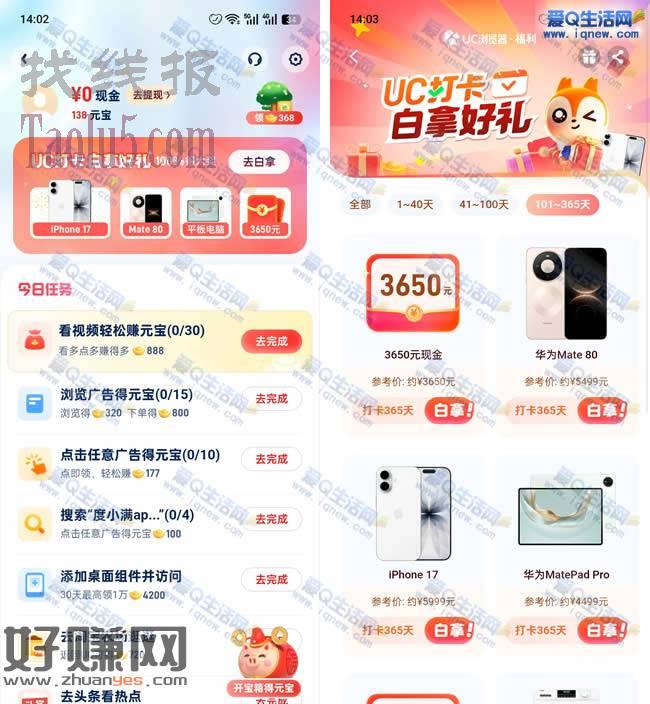 uc打卡白拿好礼 得3650元现金/实物等好礼
