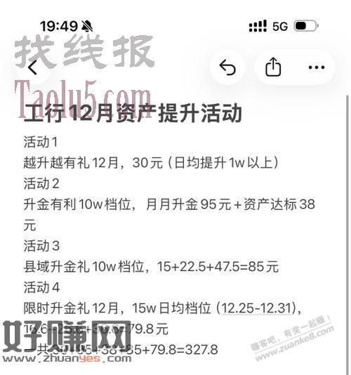 4个活动叠加,12月日均资产提升活动,在工行app任务中心的横幅都可以看到,其中活动4是前几天刚出来的记得手动报名