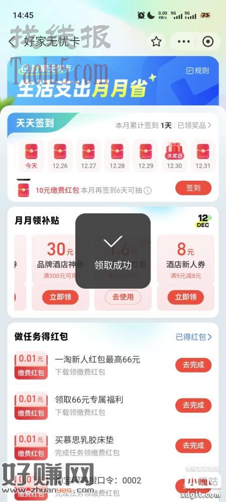 zfb搜:好家无忧卡,月月领补贴,右滑可领1.6交行数币满16可用