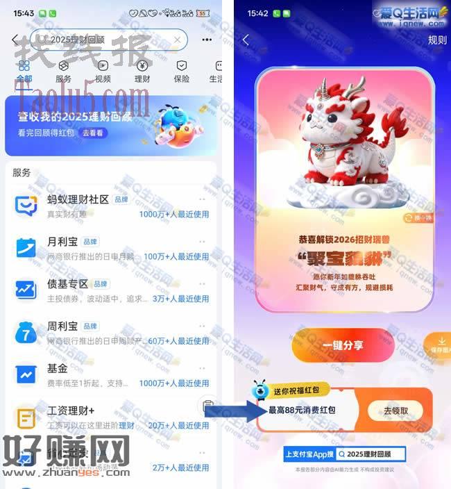 支付宝APP搜【2025理财回顾】查看表表到最后 点击底部【最高88元消费红包】领取试试