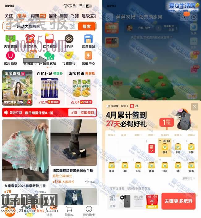 淘宝app-首页/搜【芭芭农场】-右侧【4月好礼】本月累计签到27天 10点抢好礼