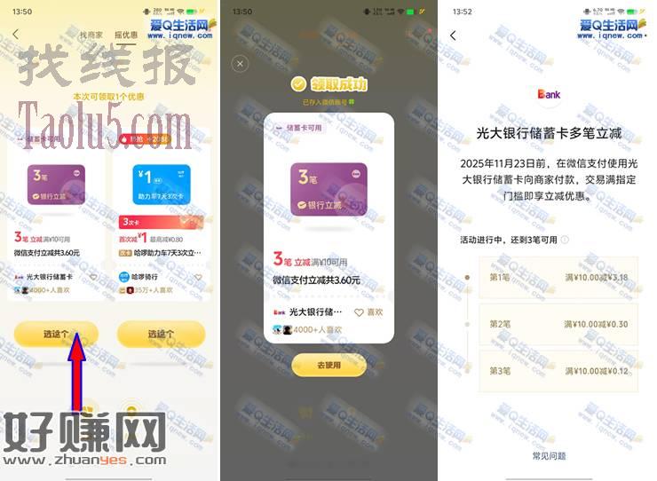 微信搜【微信支付】-右下角【摇优惠】-有光大3.6元立减金