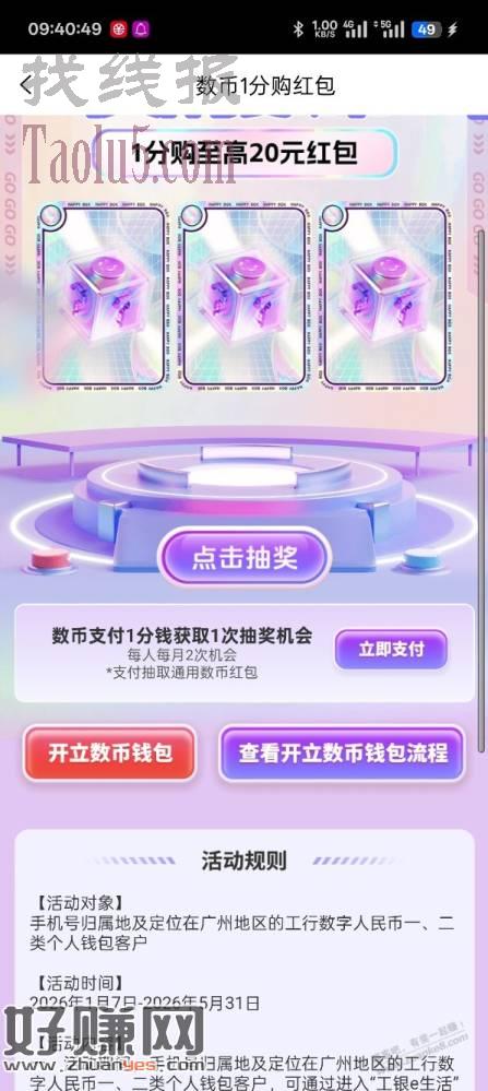 工银e生活app,一分钱买数币红包,最低5元,可以买2次,共10元