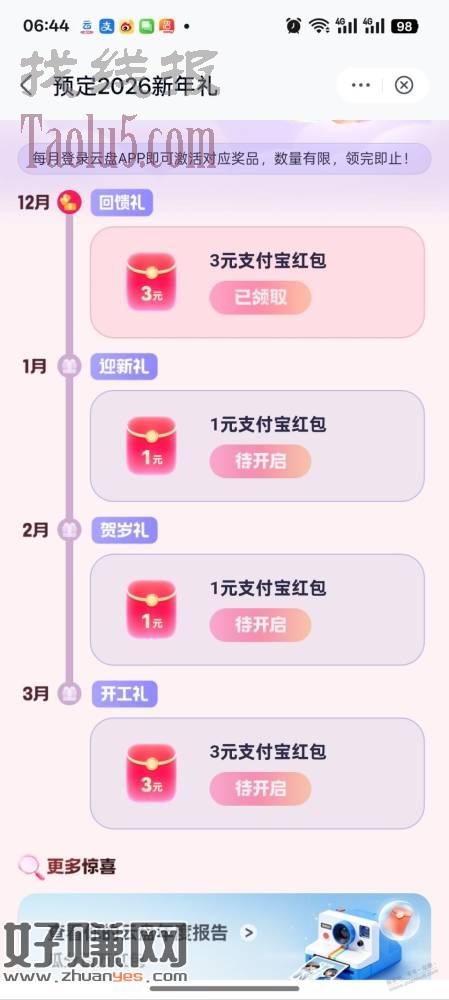 中国移动云盘,活动中心,预定你的2026新年礼,这会领的都是支付宝红包(4个月的共5元左右)