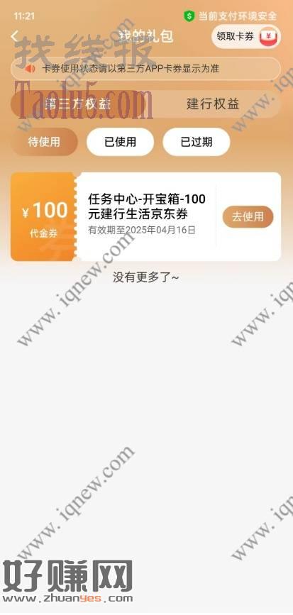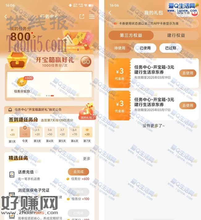 1.建行APP-我的-任务中心-1000积分开宝箱,[这个券也可以自己累积起来购买实物]