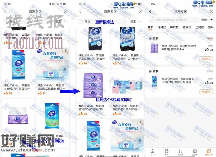 直接0撸3包维达抽纸,注意需要抽到2张3元京东券才可以哦