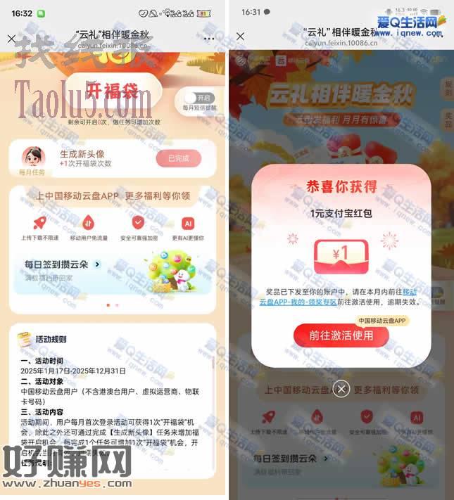 亲测1元支付宝红包 移动云盘云礼相伴暖金秋