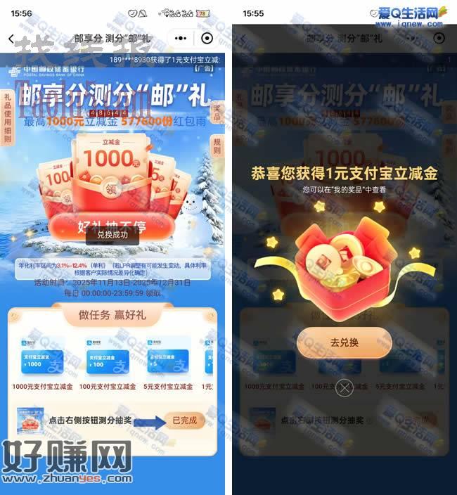 邮储测分有礼抽奖 亲测1元支付宝立减金