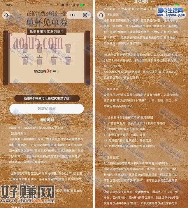 霸王茶姬领单杯免单券 今年正价消费8杯领取