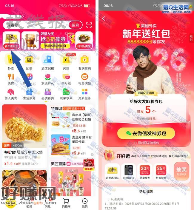 抽冰箱贴/苹果手机/红包 美团新年送红包
