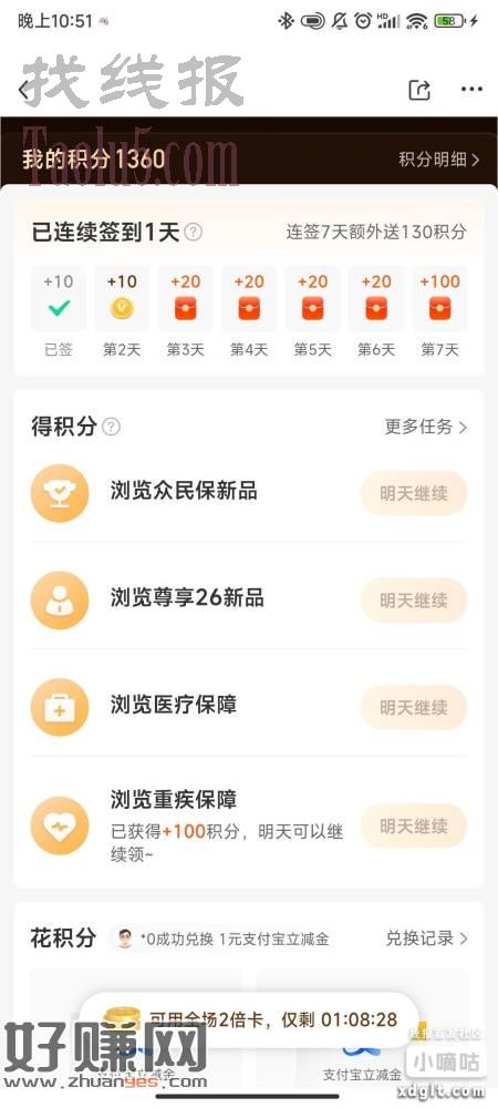 自测众安保险app有没有任务 我是得了1200积分可以换1米立减金
