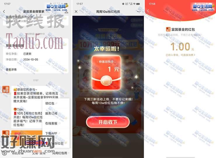 微信搜【富国基金微管家】公众号-菜单栏【周周红包雨】-10w份红包-进去抽