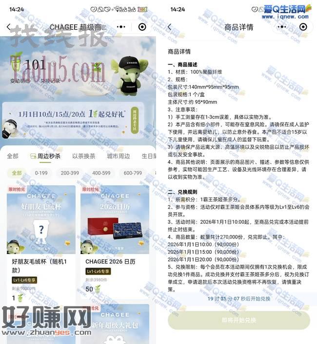 霸王茶姬茶多酚 1积分兑换毛绒杯等奖励